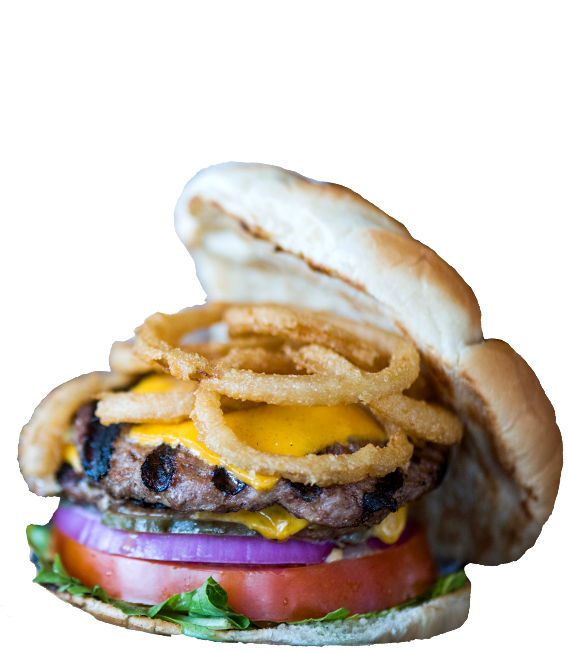 lettuce, tomato, dill pickle, jalapeno, red onion, mustard, mayo, ketchup, or barbeque sauce, covered in onion straws.